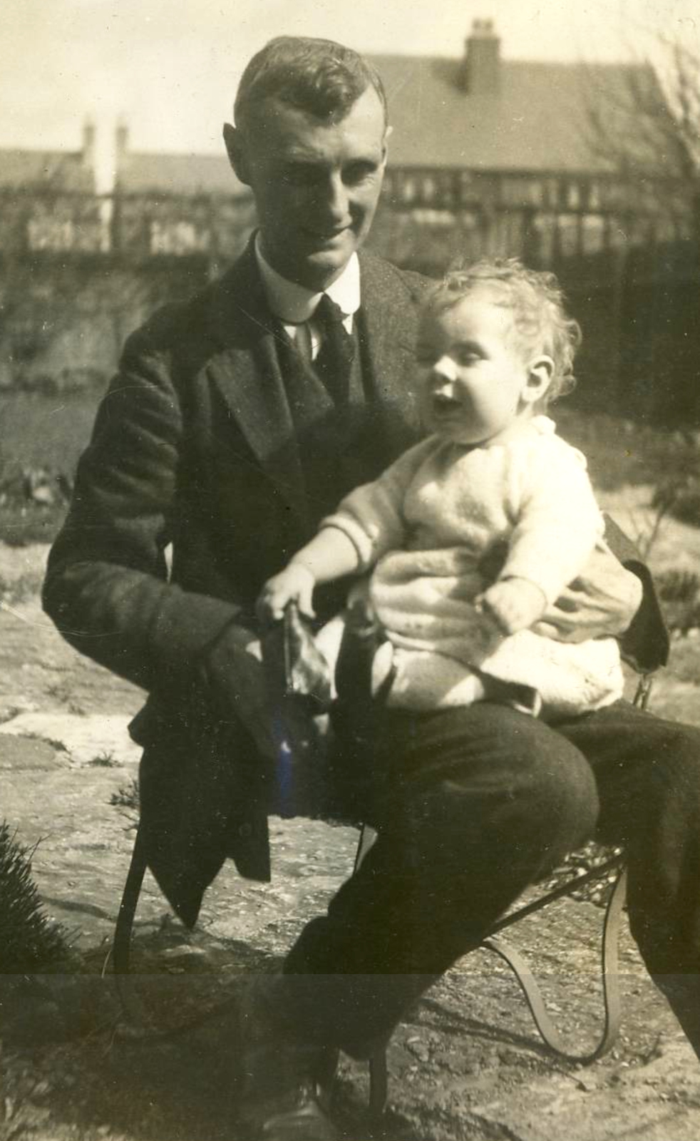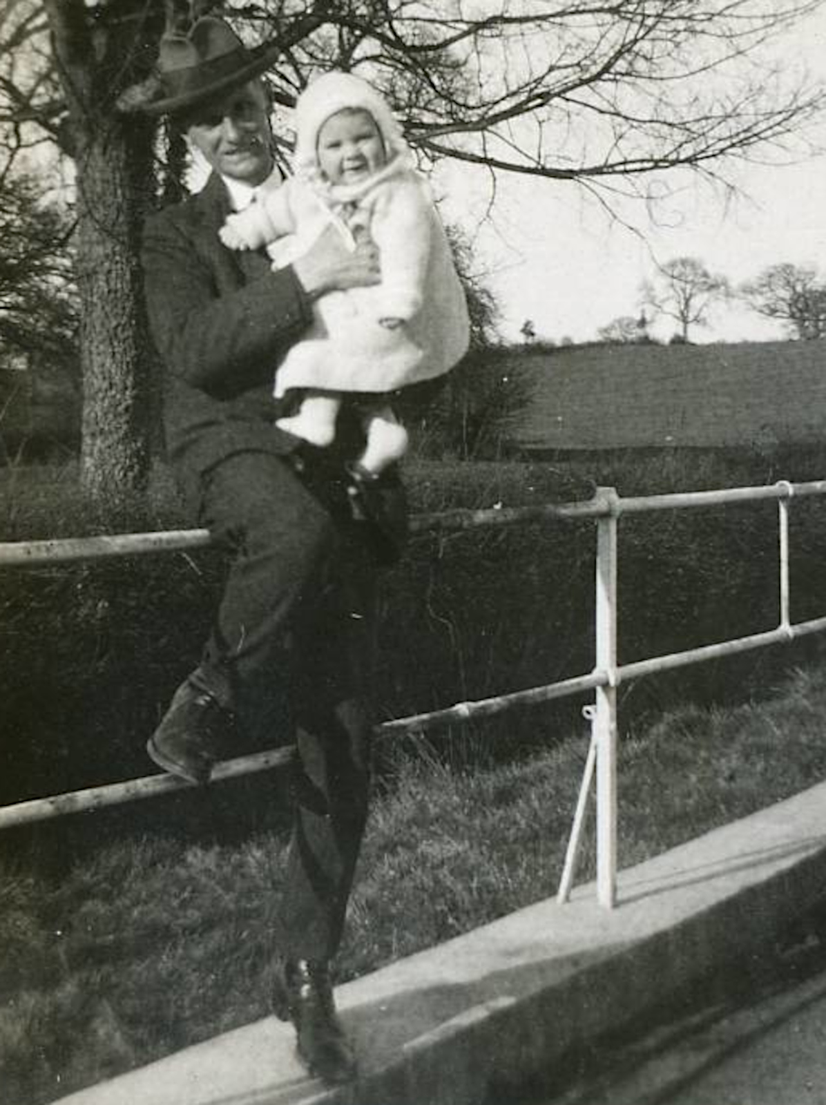 Mike (my father) was born on 4th June 1926. The photo shows him with his father, my grandpa, Ted. The album holding this photo probably belonged to Mike’s older brother, Dick and this page is clearly marked 1927. The trees in the photo are leafless, so we can date the photo to wintertime which would put Mike at around 18 months old.