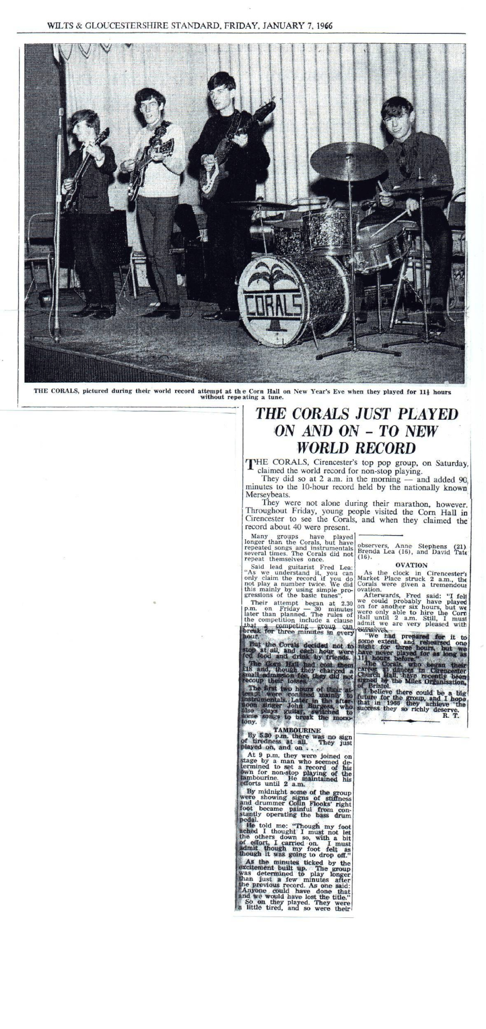 The Wilts and Gloucestershire Standard, one of the local newpapers in the area, published a story on 7th January about The Corals, a local pop group who hired Cirencester’s Corn Hall on New Year’s Eve to attempt a world record of playing popular music without repeating a tune. They played for 11½ hours so did indeed smash the previous record of 10 hours.