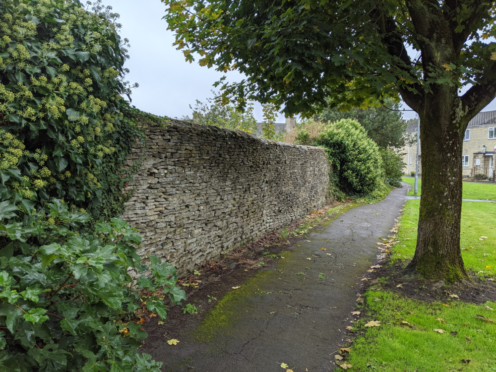The photo above shows the same trees but looks back towards the wharf; the buildings on the left are close to those in the first photo. The canal would have more or less followed the line of trees from the buildings on the left right up to the yellow vehicle, and the course of the towpath remains along the garden boundaries hidden by the parked cars. Turning 180° from this view there is a house built over the route of the canal, but walking around it and crossing the road, the footpath between the houses is again the old towpath. What’s more, a dry stone wall on the left hand side of this path is almost certainly the old boundary wall that ran along both sides of the canal. The wall is high here, about 2 m, but beyond the town and in farmland the wall was only 1 m or so. It’s easy to visualise the canal here, mentally remove the tree, imagine water where the grass is, and you have it!