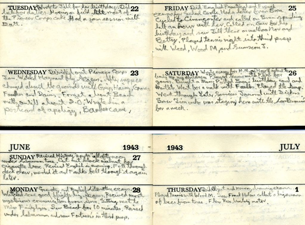 Friday 25th June – I did my English Practical and French exams for School Certificate. I had a letter from Bren, and cycled to Cirencester to visit her, spending half an hour there. I called on Guv for his birthday and saw Jill there as well as Nor and Betty. Back at school I played tennis right into third prep with Weed, M. Wood, and J. Sumsion.