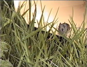 We discovered a field mouse in the house, cowering in a corner. We caught it by putting food in a tall bucket and building a way for it to climb up the outside of the bucket. The mouse jumped in during the night but couldn’t jump out again. Debbie and Beth released it in a field; in the photo it’s about to jump to freedom.