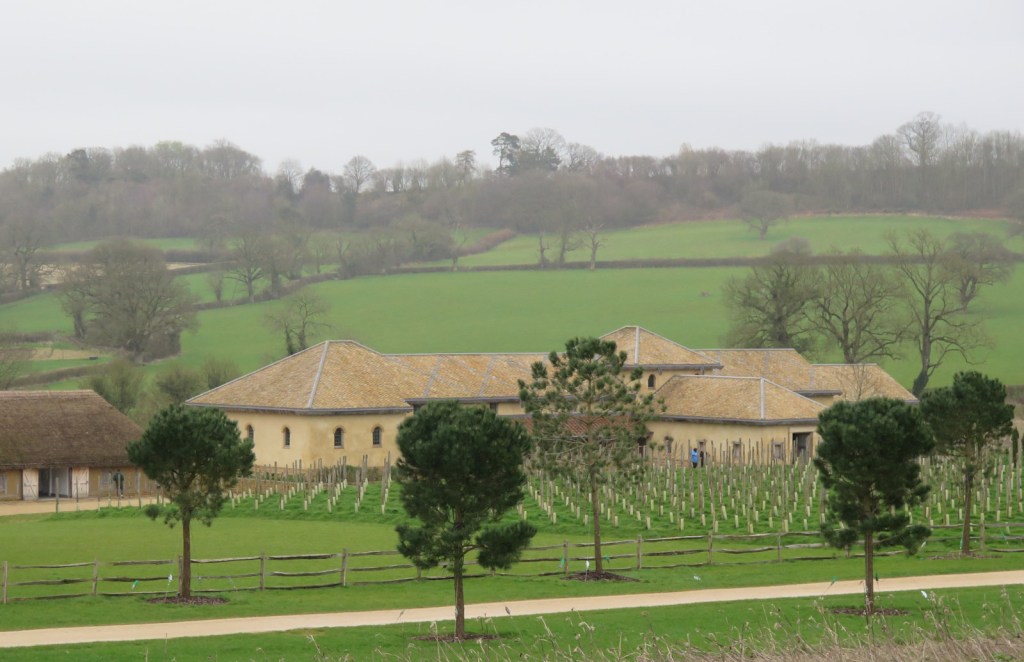 Here’s another view of the villa, you can see one of the farm outbuildings on the left, and a newly planted vineyard in front of the villa. An access road of pounded stone passes this side of a wooden fence, note the avenue of young trees growing on both sides of this road.
