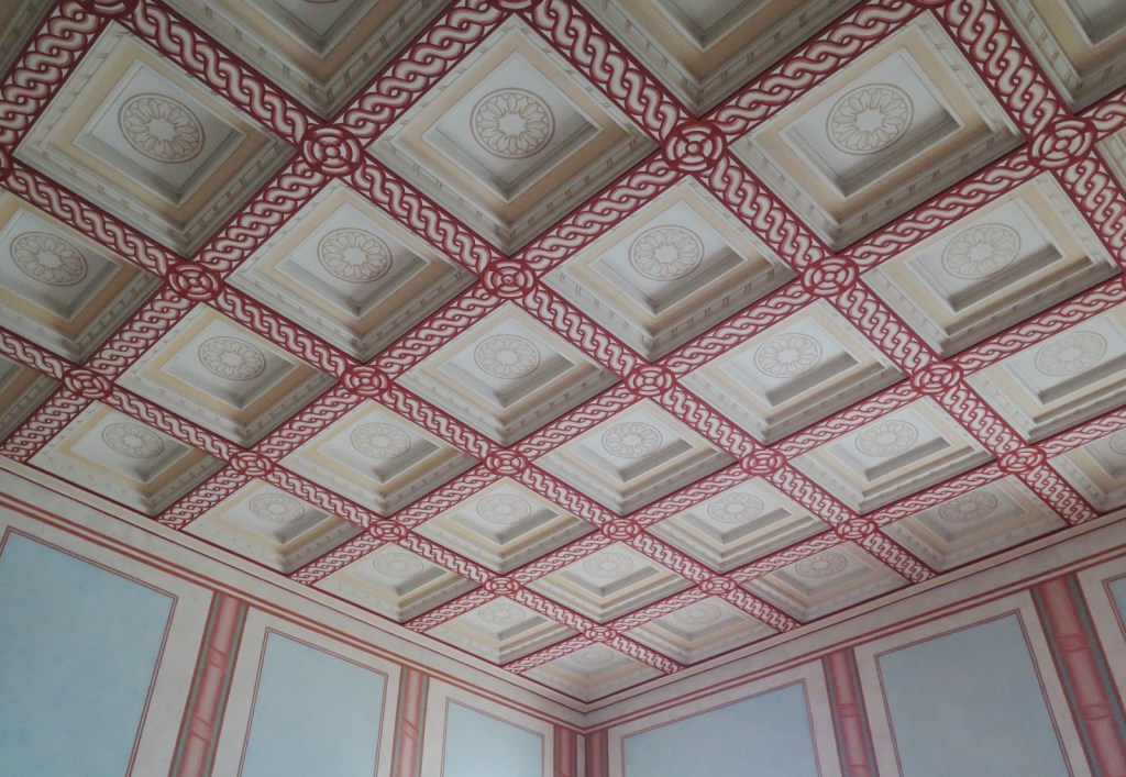 Roman ceilings ranged from plain and simple to very impressive. We’re still in the villa’s office here, a room that was required to impress, so the ceiling is moulded with recessed squares and richly decorated. Anyone visiting the Master in his office would know right away that this was a person of some privilege and power, a person not to be messed with.