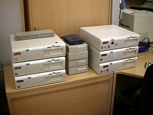 These are the web development servers in the open plan office where I worked as part of the Web Team. Today these would all be virtual servers hosted at a data centre elsewhere in the company. It was very useful to have multiple copies of each website, one for the developers to work on, another for testing purposes, and a third for the live service.