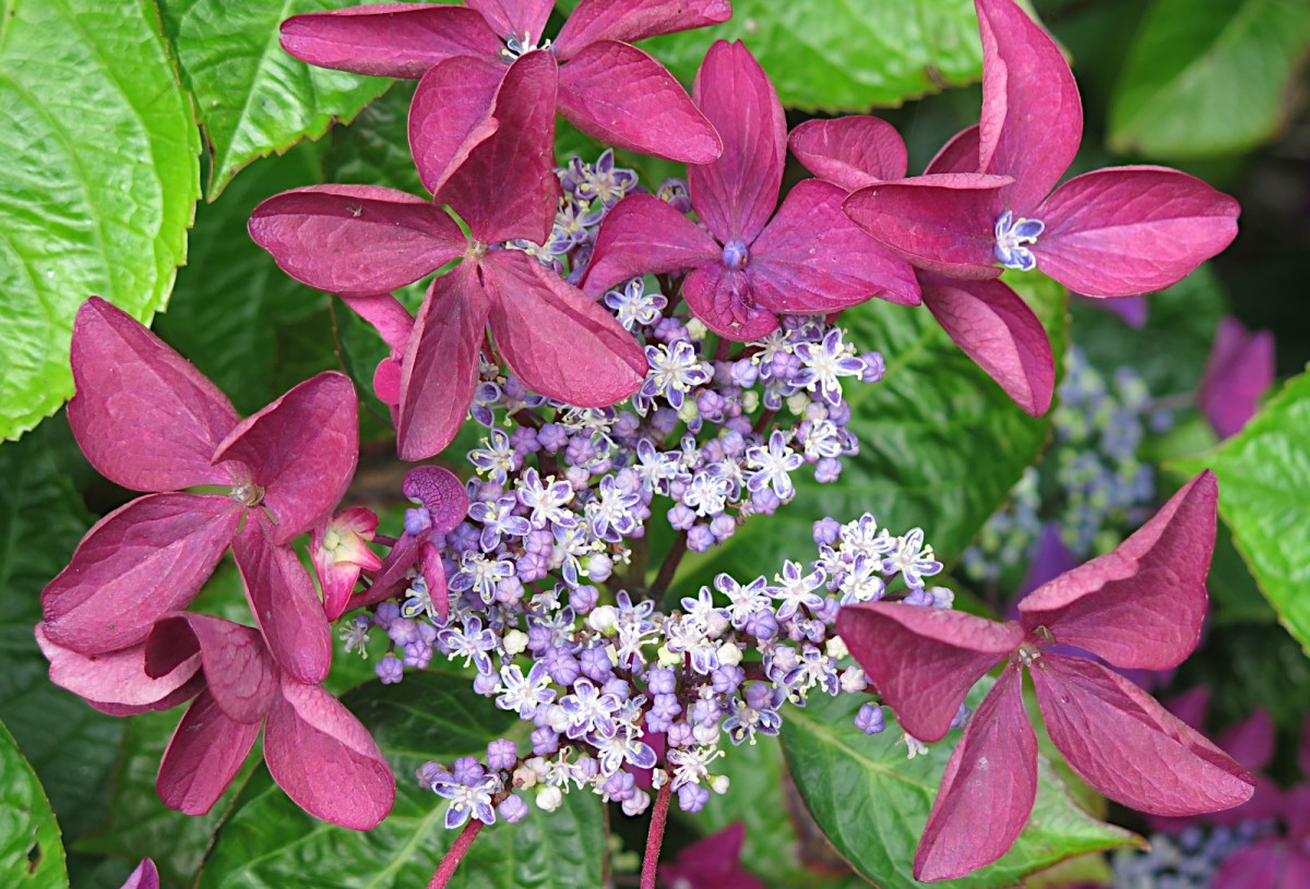 Irish gardens often have the most magnificent Hydrangeas, in striking colours, not just white, blue and pinks, but purples and very vivid blues as well as many kinds like the lacecaps where there are small inner flowers and large outer ones as in the photo.