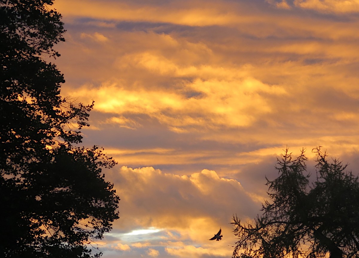Let’s start with this photo of a sunset seen from my study window. Quite by chance, as I clicked the exposure, a bird flew out of a tree and then shot automagically composed itself! It looks like something from the Cretaceous, a flying dinosaur with four wings, or a raptor that’s just snatched some unlucky feathered prey. Anyone have other opinions on ID?