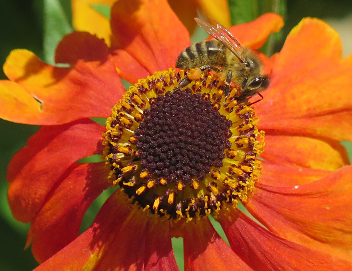 The worker honeybee in the photo is collecting pollen. Insect-pollinated plants have slightly sticky pollen that lodges on the bee’s hairy body. Bees visit flowers to collect nectar from the base of the petals, but get dusted with sticky pollen in the process. Bees clean themselves like most insects (you’ve probably seen houseflies doing it, sweeping off particles of dust with one leg while standing on the others). When bees clean themselves, most of the pollen end up stuck together as a lump and lodges on a series of special hairs on the hind legs. Look closely and you can see this bee’s pollen load on its rear leg; an orange/yellow colour. Pollen is protein rich and the bees feed it to the bee pupae in the hive.