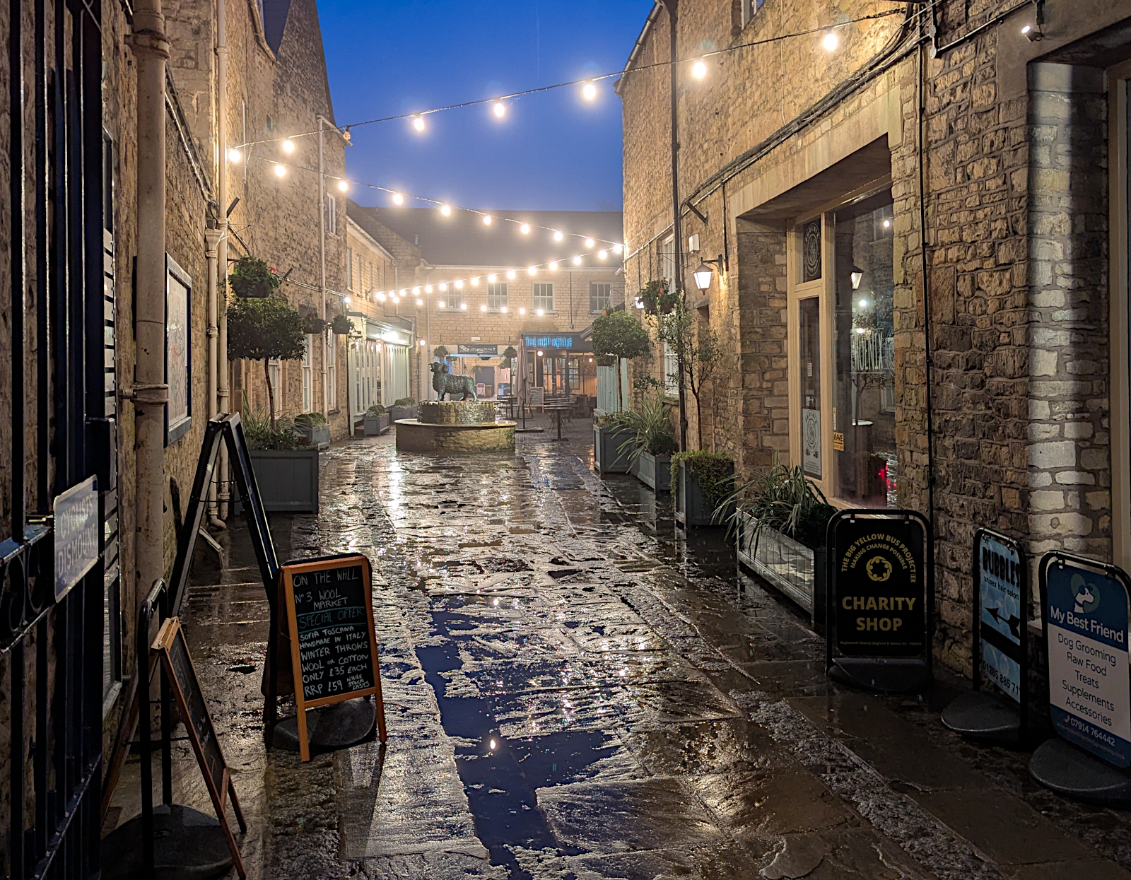 I took this photo on a wet evening on 18th January 2026, the paving slabs of natural stone glistening in the overhead lighting and the more distant buildings softened by descending mist as the damp atmosphere cooled down following sunset. It’s very typical of January in the Cotswolds. Sometimes we get snow, and heavy frosts are possible, but often it’s just a chill damp with muddy fields and foggy mornings.