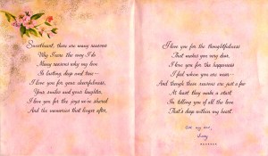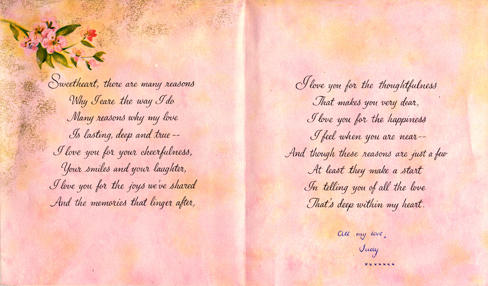 Judy sent me a valentines card (I sent her one too, of course. The photo shows the contents, in verse and wordy (normal in those days), but the sentiments were heart-felt. Cards have changed since 1966 but falling in love never grows old. We were both still at Cirencester Grammar School where we had met. I was in the Upper Sixth and Judy was still Lower Sixth so we were able to see each other almost every day.