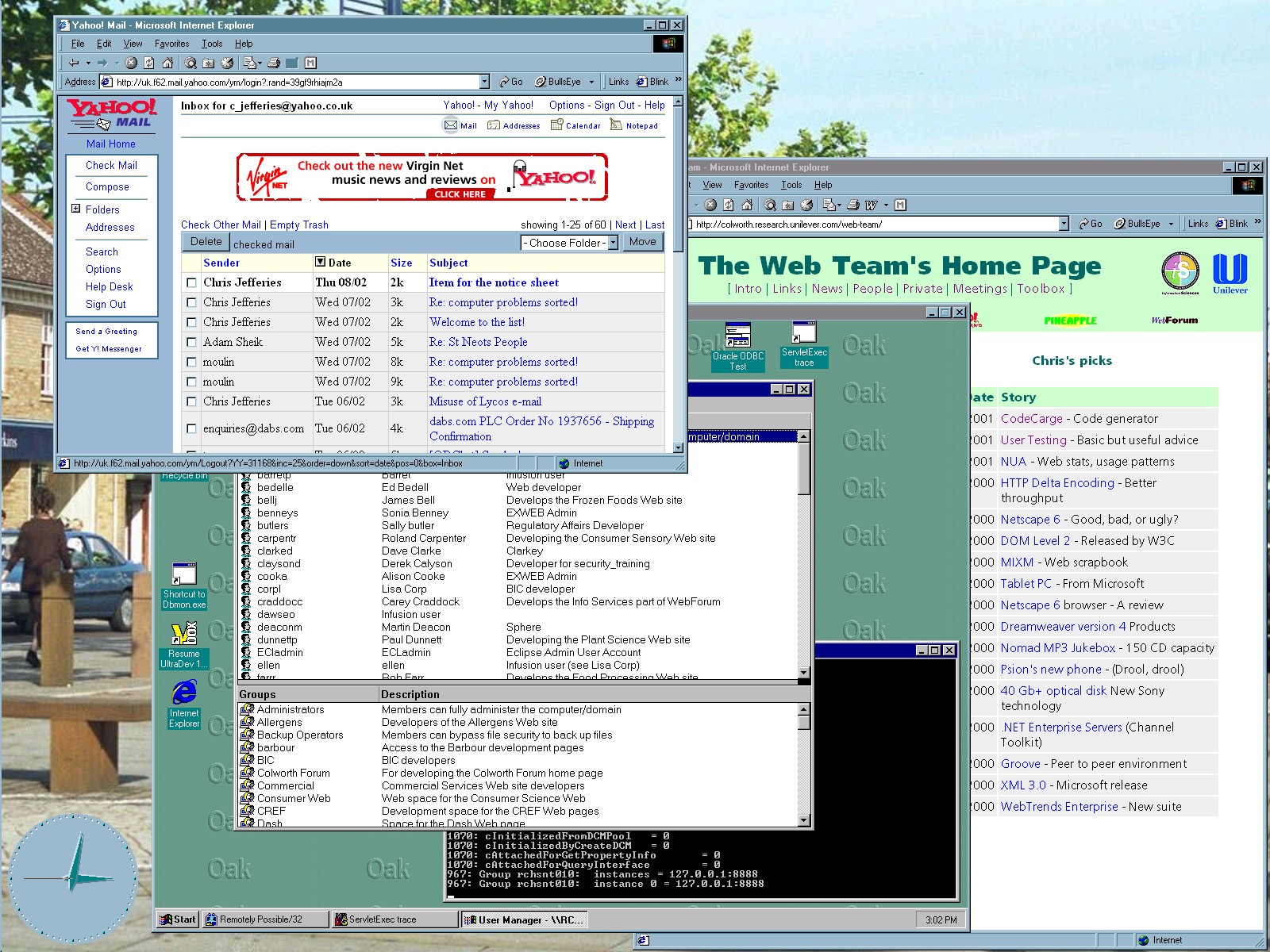 This screenshot from my PC at Unilever shows some interesting features from 25 years ago. The main window with a background image of St Neots Market Square and the clock in the lower left is from Windows NT running on my desktop work PC. There are also two web browser windows open, an early version of Microsoft’s Internet Explorer. One of these is displaying my personal email service provided by Yahoo! The Web Team page was an Internal Unilever site containing work information for the team I was part of.