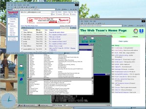 The remaining window with a darker green background and the name ‘Oak’ repeated in rows and colmns was a VNC window displaying a virtual desktop from one of our web servers so that we could access it without having to be physically present in the server room. There are two windows open on ‘Oak’, one displaying users and groups on the server, the other a DOS command window being used to manage the ‘Oak’ server.