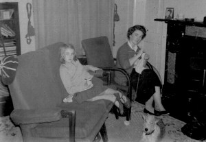 I believe this photo was taken in February 1961 in the room we always knew as ‘the back sitting room’. Mum is knitting, Cindy has a pen in her hand so was writing, Chloe the dog and Figum the cat are on the floor enjoying the warmth from the fire. My school photo is on the mantelpiece along with a teacup, and my school cap is on the back of the sofa. That’s quite a lot of information from one very poor quality B&W photo.