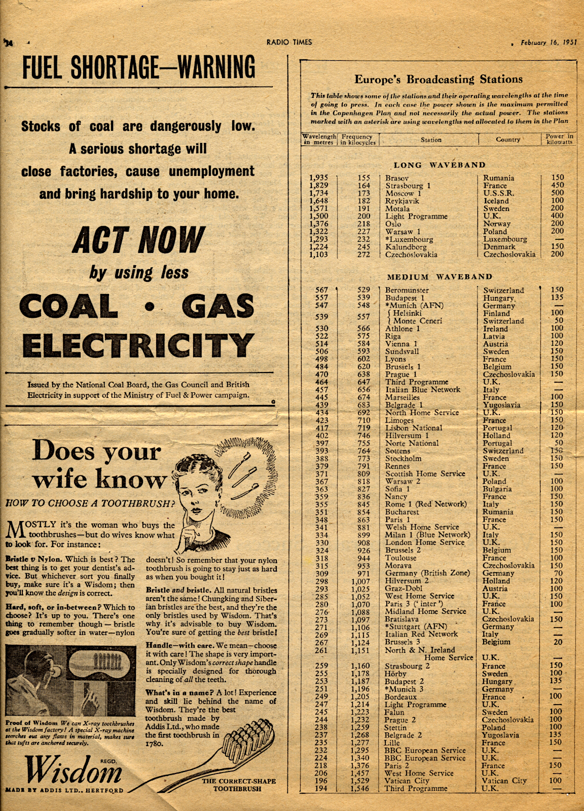 The image shows a page from The Radio Times, kept by Dad because it has a useful list of station wavelengths and frequencies. The adverts on the left of the page are interesting, coal was in short supply and the public were being asked to reduce energy usage, and it seems that wives (and never husbands) buy the tooth brushes. As always, click the image to enlarge it.