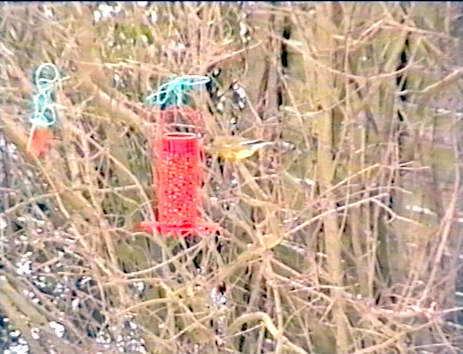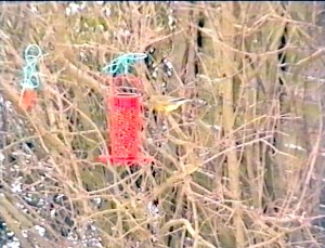 The second image shows a greenfinch checking out peanut seeds that Judy had hung from Berberis branches. These were very popular!