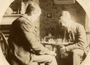 My grandfather, Edward Arthur Jefferies was born in 1879 at 10 Tower Street, Cirencester, his parent’s home. The photo shows him in Watermoor Cottage as a young man playing chess with his younger brother Herbert. Edward is facing the camera.