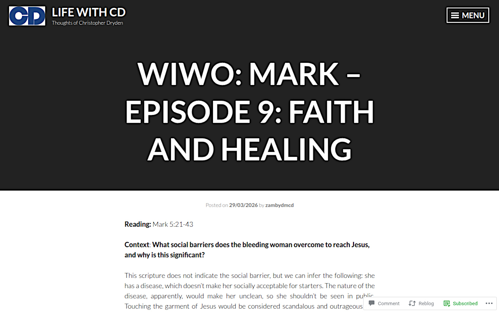 Seen in that light, the amount she’s overcome to reach out speaks volumes about the faith she has that a single touch could make all the difference. It explains Jesus’ own commentary on the situation: her faith has made her whole. And as I reflect on that, there’s a nudge to consider what level of faith is required to trust Jesus. And also, there’s a challenge of how we can demonstrate and declare, for the benefit of other social outcasts, that their issues can be solved by reaching out to touch Jesus, who is near them?