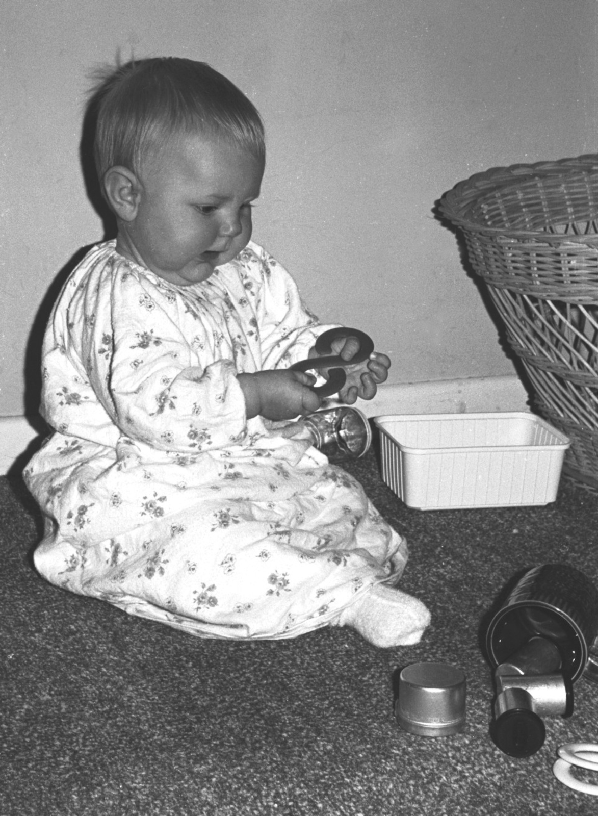 This photo of Debbie was taken on 1st November 1975. You can also see one end of the basketwork crib Judy made before Debbie’s birth, and the toys include film canisters, other jars, boxes and bottles, and some interlocking plastic shapes from Mothercare.