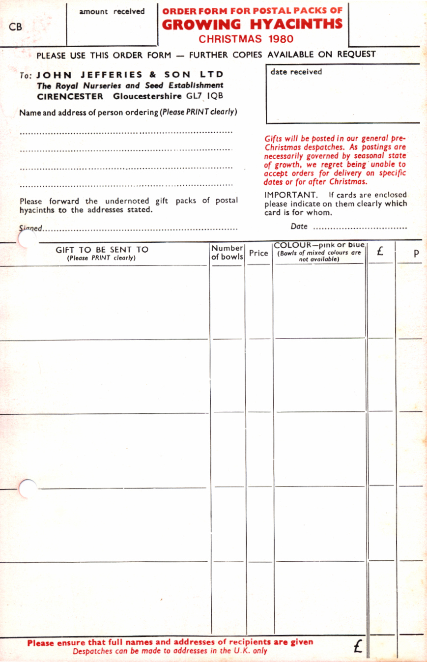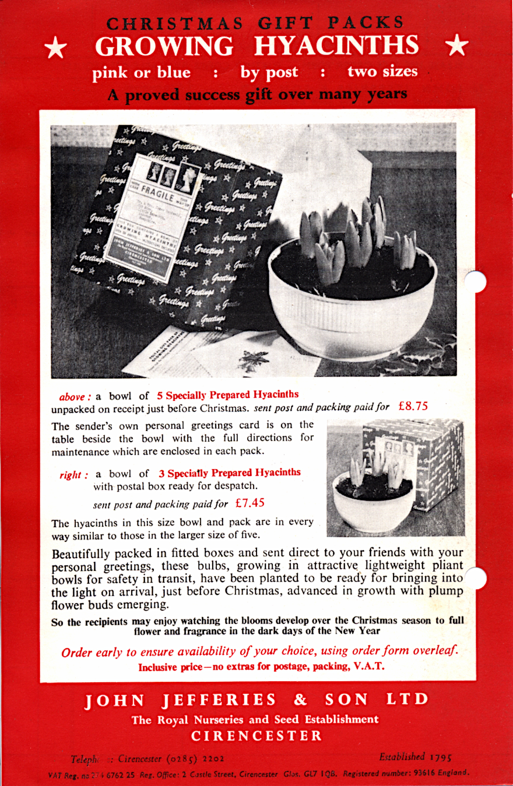 John Jefferies & Son published their Christmas Hyacinth Gift Pack leaflet and order form (one of the last few years before closing the shop and selling the garden centre to Country Gardens). Here’s the order form that was circulated with the leaflet.