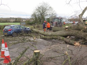 Shortly before Christmas a huge lime tree fell across the Gloucester Road between Cirencester and Stratton, demolishing a section of the Cotswold wall on the west side of the road, taking out a big chunk of the hedge on the east side, and almost crushing a passing car. The driver must have had a very narrow escape.