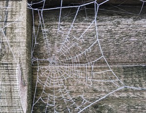 Cobwebs are so-called because ‘cob’ is an old English word for ‘spider’. As you will know, they are usually very hard to see, but moisture or frost renders them clearly visible when weather conditions are right. This example on the wooden fence at the end of our garden is typical.