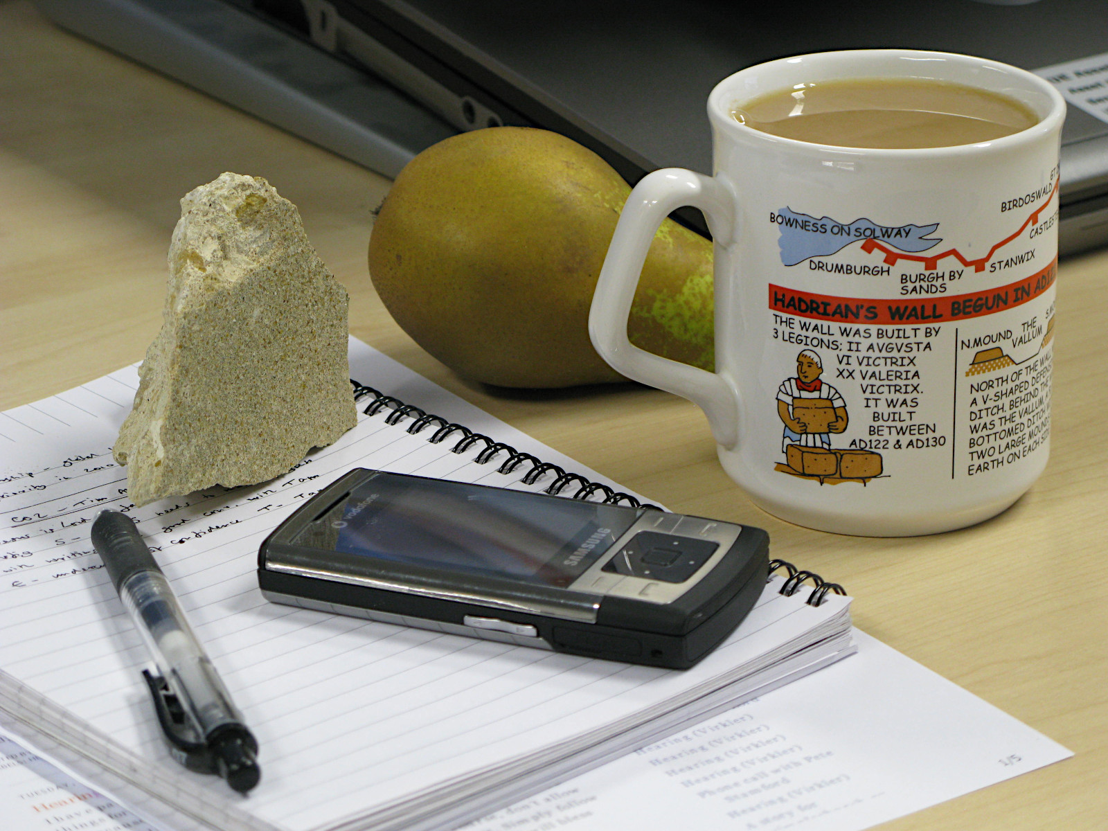 The photo (right) shows items on my desk on 24th, including a mug of tea, a Conference pear, my Samsung Steel phone, notebook, roller pen – and a piece of the old building rescued from the cleared site!