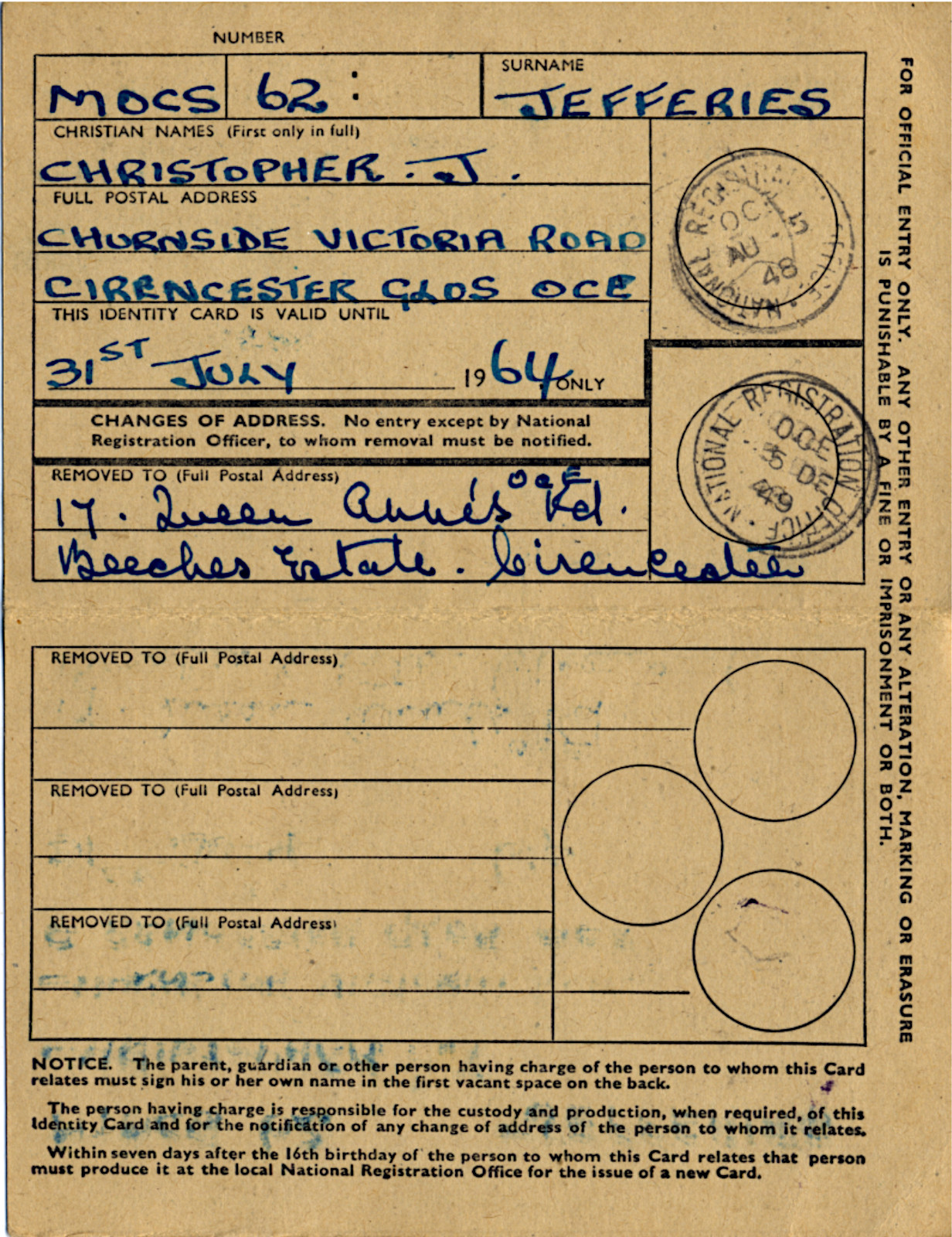 Mummy, Daddy and I moved house! We had been lodging with my grandparents in Victoria Road, Cirencester. But on 5th December we were able to move into a newly built council house on the Beeches Estate just the other side of the river. I had a change of address on my identity card (see whole card).
