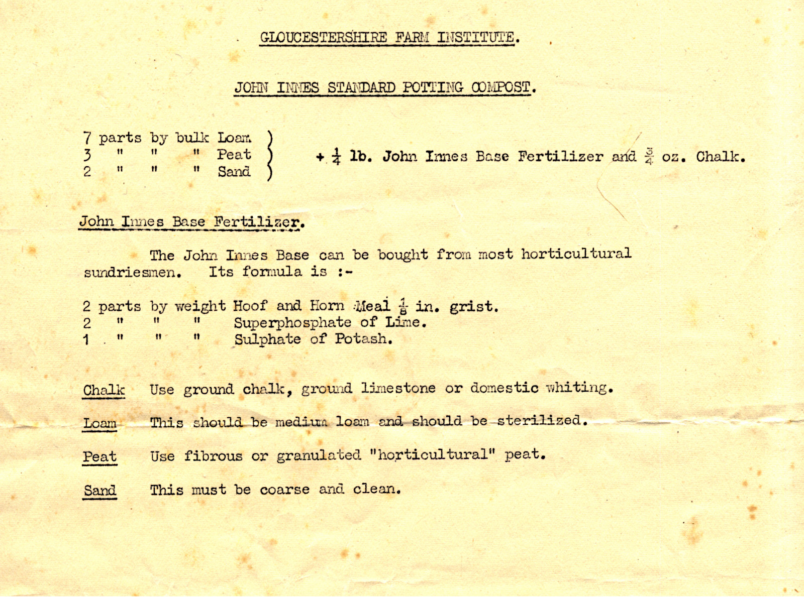 Daddy worked at Watermoor Nursery as the foreman assisted by Miss Brown. They took cuttings, split larger herbaceous plants, and kept the rows hoed and watered. They would have had extra help at busy times. The recipe for John Innes compost would have been used by them around this time.
