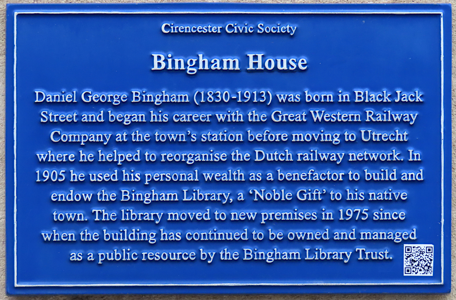 Bingham worked in railway management, first at Cirencester, later at Paddington in London, and finally in Utrecht in the Netherlands where he became wealthy. He visited Cirencester briefly but quite regularly and spent part of his wealth providing the library in 1905 and the Hall in 1908. He and his wife Jane had friends and family in Utrecht so they were always keen to remain living there, though clearly Bingham retained a fondness for his town of birth – Cirencester.